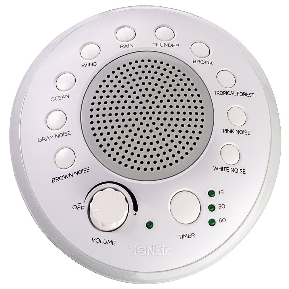 • The SONEic - Sleep, Relax and Focus Sound Machine. 10 Soothing White Noise and Natural Sound Tracks, with Timer Option. Crystal Clear Quality Sound Speaker & Headphone Jack. USB or Battery Powered - White is a
