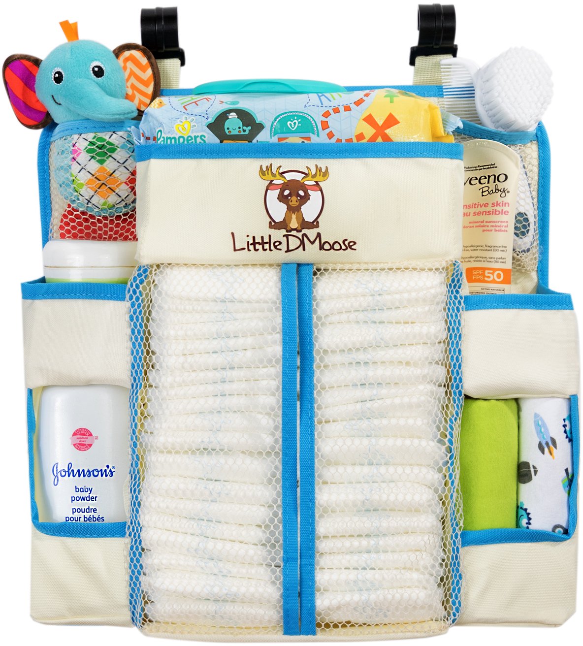 • The Baby Nursery Organizer & Diaper Caddy by Little DMoose (15” X 14”) – Plastic Back Support for Added Stability, Reinforced Shelves, Strong Velcro, Smart Hooks and Eyelets for Hanging is a