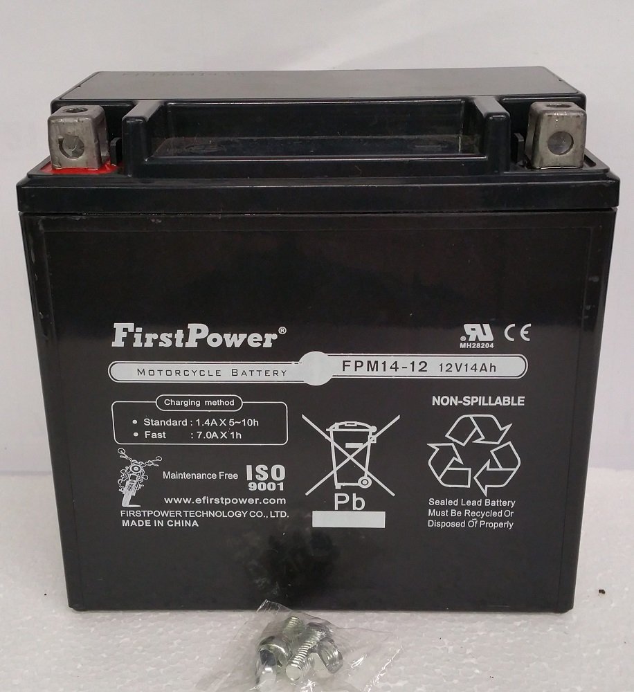 Pack of 2 9V Ni-MH Rechargeable BatteriesImproved anti-corrosion components and new zinc composition resulting in 10-years anti-leakage shelf lifeDesigned to provide reliable and lasting performance for both high and low drain devicesUnique technology that enables better performance after storage, over-discharge, and high temperaturesWorks with a variety of devices including digital cameras, game controllers, toys, and clocks; Rechargeable.the (1) FirstPower FPM14-12 for Yamaha XS500 XS650 FZ700 FZ750 FZR1000 FJ1200 VT480 How do the Recharge Universal batteries last so long? Advances in battery technology have minimized self-discharge and natural aging effects, resulting in a 5-year battery life with normal usage. Improvements to the engineered alloy used in these batteries created the ideal balance for consumers like you: high-capacity power and the ability for the battery to hold its charge. Recharge Universal can be recharged up to 1000 times, consistently delivering long-lasting and stable voltage to your most energy-needy devices.(1) FirstPower FPM14-12 for Yamaha XS500 XS650 FZ700 FZ750 FZR1000 FJ1200 VT480 is best for youThe FirstPower Motorcycle battery is engineered to protect against seepage and corrosion, deliver high cranking power, even when the weather's dealing its worst. It's the rugged, reliable and dependable battery that customers are looking for. The high-tech. Power-boosting design, FirstPower Motorcycle battery can provide right battery for right job - that's where it all starts.The industry standard for motorcycles snowmobile and riding mowers, our motorcycle battery offers high cranking power, nice cold cranking performance, minimal internal resistance, maximum power.With the lead-calcium technology and the AGM used, our Maintenance-free VRLA type motorcycle battery assume really sealed, Never needs refilling, offer a really maintenance-free battery for you. Non-spillable (no acid leakage). Can be used immediately and not need activation procession. High cranking current for rigors of cold weather starting. Resist vibration damage packs in extra plates. Resist corrosion for longer battery life. Resist damage from gas, oil, impact.Specifications :Dimensions:L: 5.94' W: 3.42' H: 5.86' Weight: 10.4lb12v 14ah