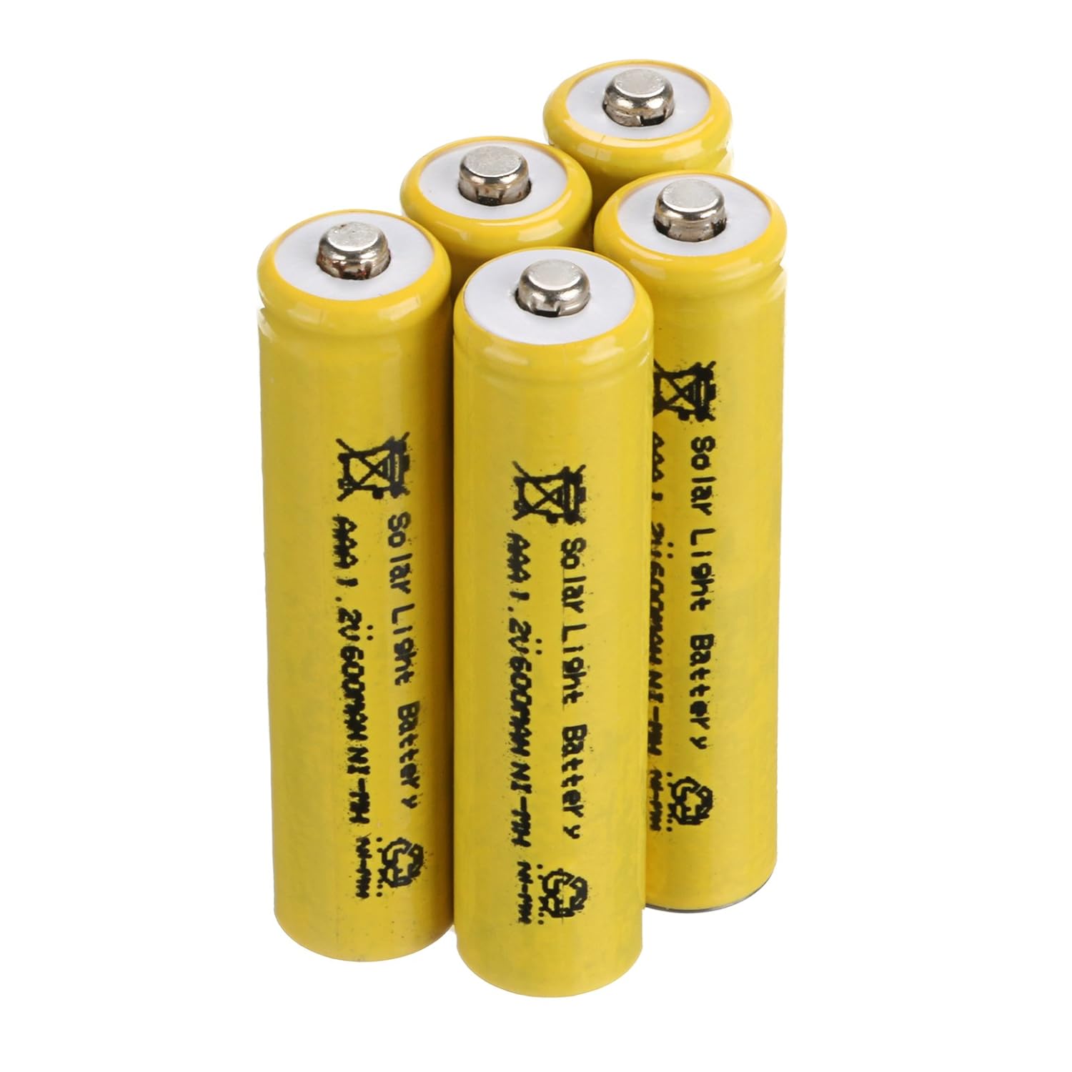 Pack of 2 9V Ni-MH Rechargeable BatteriesImproved anti-corrosion components and new zinc composition resulting in 10-years anti-leakage shelf lifeDesigned to provide reliable and lasting performance for both high and low drain devicesUnique technology that enables better performance after storage, over-discharge, and high temperaturesWorks with a variety of devices including digital cameras, game controllers, toys, and clocks; Rechargeable.the Windmax 5PCS Yellow 3A AAA Solar Light 1.2V 600mAh NiMH Rechargeable Batteries For Lights How do the Recharge Universal batteries last so long? Advances in battery technology have minimized self-discharge and natural aging effects, resulting in a 5-year battery life with normal usage. Improvements to the engineered alloy used in these batteries created the ideal balance for consumers like you: high-capacity power and the ability for the battery to hold its charge. Recharge Universal can be recharged up to 1000 times, consistently delivering long-lasting and stable voltage to your most energy-needy devices.Windmax 5PCS Yellow 3A AAA Solar Light 1.2V 600mAh NiMH Rechargeable Batteries For Lights is best for youBrand new and high quality Voltage: 1.2V Capacity : 600mAh Battery type: AAA battery, 1.7*0.4 inch Chemistry: Ni-MH ( Nickel Metal Hydride ) Color: Yellow Package Content: 5 x AAA 600mAh Ni-MH Rechargeable Batteries