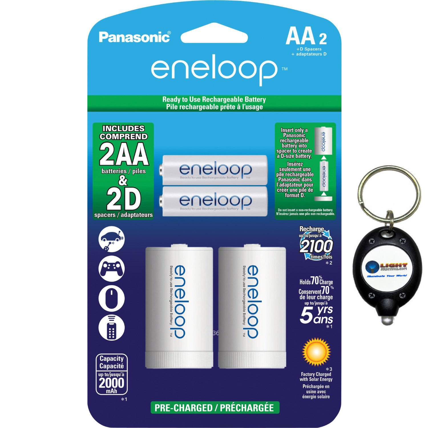 Panasonic Eneloop 2100 cycle Pre-charged ready to use 2x AA batteries + 2x "D" size spacers/adapters + Keychain light is best for youEneloop AA batteries:-Eneloop Ni-MH 2000mAh typical /1900mAh minimum (AA)-Hold up to 70% of their charge after 5 years of non-use-Can be recharged up to 2100 times-Work in extreme temperatures down to -4° F-Ni-MH, Low Self Discharge rechargeable batteriesEneloop D Spacers/adapters:-Quickly and easily convert eneloop AA batteries for use in 'D' size battery applications-Great to have on hand in case of emergency-Made from high quality, durable plastic-Weight on 0.35 ounces (C) and 0.77 ounces (D)-Genuine eneloop quality