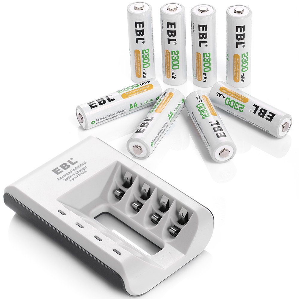 EBL 807 LED Rapid 4 Bay Individual AA AAA Rechargeable Battery Charger with 8 Packs AA 2300mAh Rechargeable Battery is best for youAbout product:EBL® 807 battery charger is designed very portable and lightweight ,perfectly charge for 1/2/3/4pcs AA/AAA Ni-MH/Ni-Cd batteries. You can charge battery by single. What's more, this charger uses low constant current charging technology,LEDs will turn to LIGHT YELLOW from RED when the batteries are charged up to 80%,and then automatically switches to trickle charging for about 40 minutes could reach to 99.3% capacity.These EBL® AA Ni-MH rechargeable batteries are great for use in your household devices, such as digital cameras, toys, remote controls,hand held games,2-way radios, PDAs, flashlights,alarm-clocksand portable audio players, delivering dependable power allowing you to maximize your music, gaming, computer, photography and other experiences .They come pre-charged and can be used immediately out of the package.They can be recharged up to 1200 times when fully or partially drained which makes it extremely economical, and provides an expected life similar to that of the device in which it is used.Besides,improved low self discharge makes it still maintain 75% of capacity after 3 year of non-use. Specification:Input: AC 100-240V AC 50/60HzOutput: 1.2V DC 800mA 200mA(AA x2,x4,x6,x8) 180mA(AAA x2,x4,x6,x8)No Load Power Consumption:1W MAXFull Load power consumption:5W MAXBattery Charge Rate:>80%Compatible with: AA/AAA Ni-MH/Ni-Cd rechargeable batteryPackage:1 x EBL® battery charger8 x AA rechargeable batteries1 x user manual