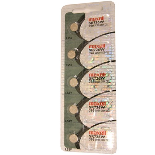 Maxell Watch Battery Button Cell SR726W 396 Pack of 5 Batteries is best for you5pk Maxell Silver Oxide Watch Battery SR726W High Drain Replaces 396The 396, or SR726W, is a rare Silver-Oxide cell normally used in watches, with a shelf life of 5+ years. Other applications may include calculators, film cameras, medical instruments, cash registers, or FA instruments (Measuring Instruments, Onboard Microcomputers, Sensors). This is a 'W' high drain battery. High Drain batteries are for applications with a continuous, low power consumption and occasional high peaks: Analog and digital watches with extra functions (backlight, alarm), pocket calculators, electronic games, cameras, etc. This is in comparison to low drain batteries, which are best used in devices that use a small amount of power over a long time: Analog watches, TV remotes, alarm clocks, etc.SpecificationsChemistry: Silver OxideVoltage: 1.55VCapacity: 28mAhDiameter: 7.9 mmHeight: 2.6 mmIncludes 5 batteriesFeaturesHigh Drain - Best used with multi-function watches incorporating an alarm, illumination light, etc.A flat discharge curve during discharge supplies a stable voltage until the end of the discharge lifeHigh-energy density per unit volume provides 2x the amount of energy capacity as button-type alkaline batteriesFeaturing Maxell's original leak-resistant processingAlso Known As: 10 L 126/D 394, 1161SO, 280-17, 394, 394A, 625, AG9, D394, GP394, L936, LR936, R 394/27, RW 335, RW33, S33, S936S, SB-A4, SG9, SP394, SR 45, SR 936 SW, SR45, SR45H, SR936, SR936SW, V394, W33Need more than one? We offer great discounts on quantity orders and Discount Shipping offers available.SpecificationsBrand: Maxell Output Voltage: 1.55V Amperage: 28mAh Chemistry: Silver Oxide Battery Size: 396 / 397 Height: 2.6mm Diameter: 7.9mm Country of Manufacture: JapanCompatibilityAlba: V001, V041, V061, V062, V401, V421, W200, W201, W207, Y130, Y468, Y490, Y499, Y643, Y670, Y800 Ansi: 1163SO